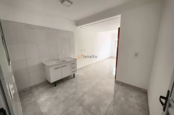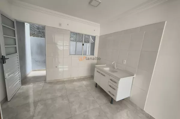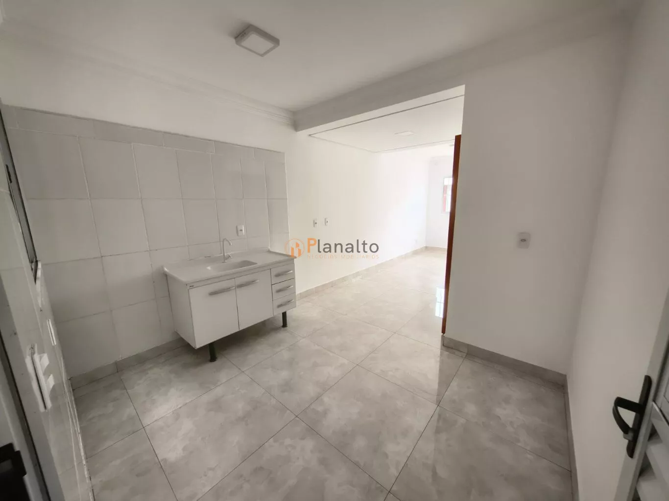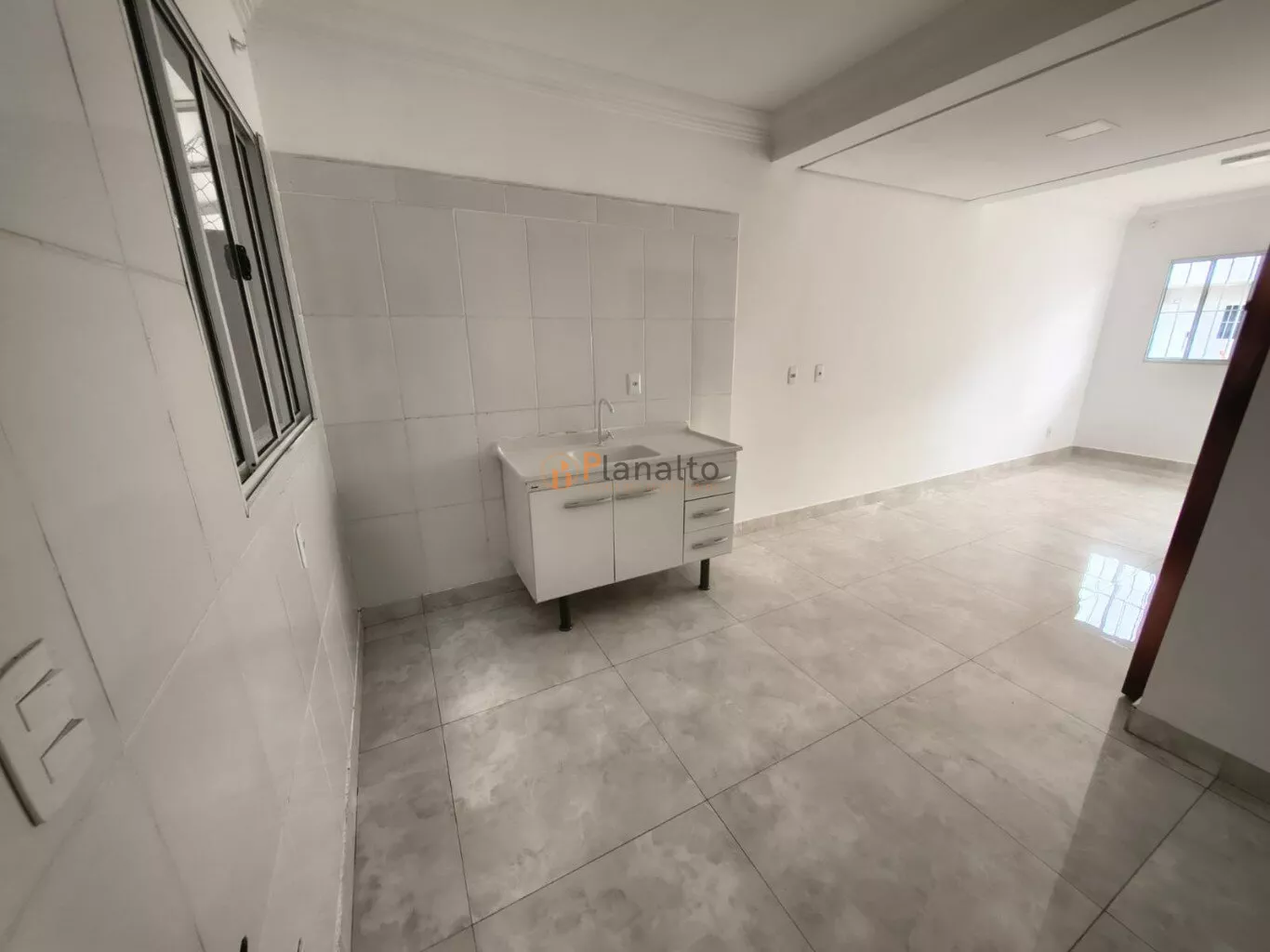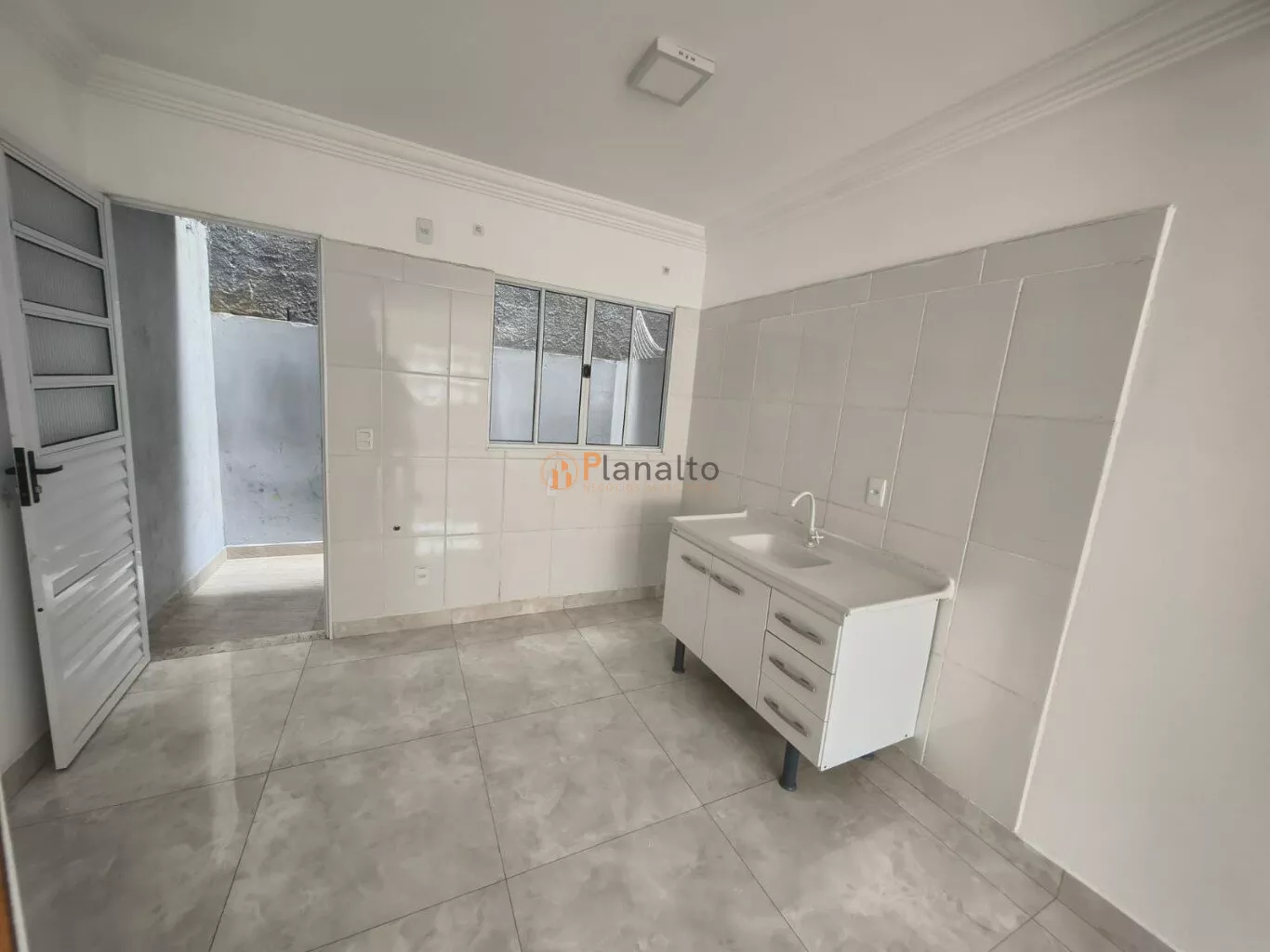 Cozinha com pia, gabinete e torneira instalados